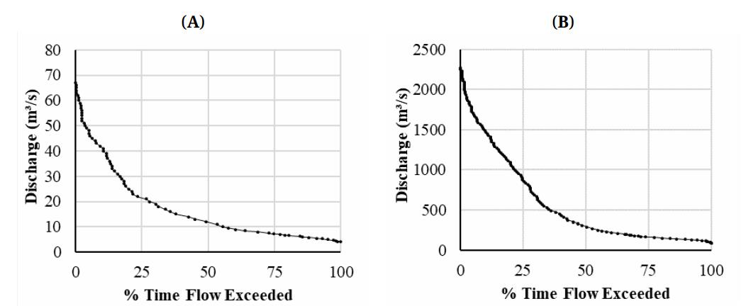 Figure 9. Flow duration curves for (A) rainfall- and groundwater-fed river in the UK and (B) a glacier-fed river in Nepal. (Data taken from [47] and [18]).