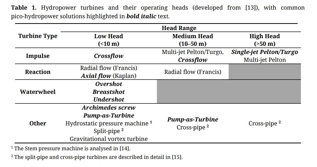 Table 1. Hydropower turbines and their operating heads (developed from [13]), with common pico-hydropower solutions highlighted in bold italic text.