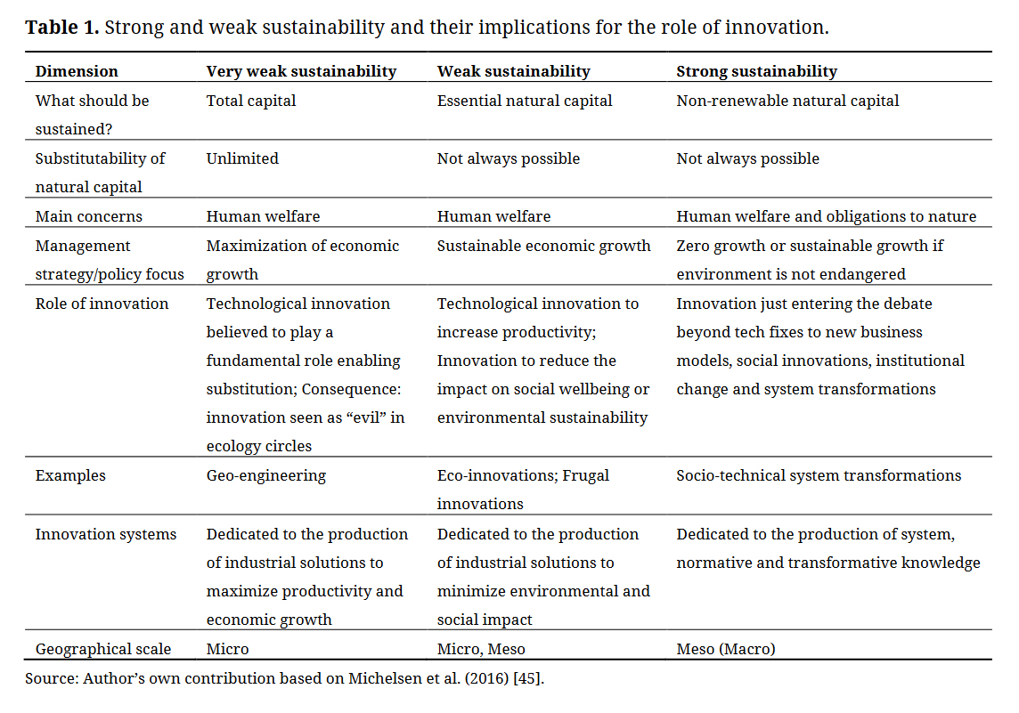 Table 1. Strong and weak sustainability and their implications for the role of innovation.