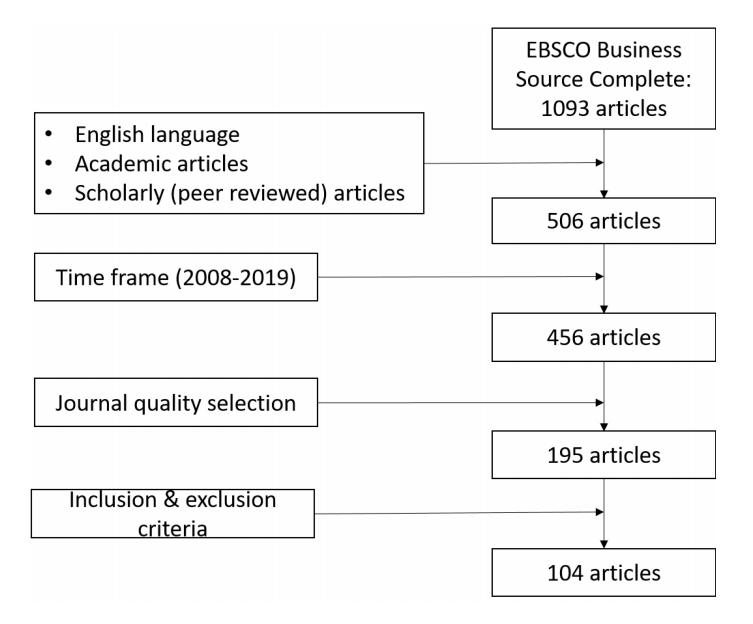 To ensure the relevance of these articles, additional inclusion and exclusion criteria were applied. To be included in the sample, the core of the article must refer to SBMs, BMfS or BMIfS. Articles with more general references to sustainability were excluded. The second selection criterion was reference to the concept of sustainability combined with triple bottom line (economic, environmental and social); reference to sustainability combined only with financial viability meant the article was excluded. The titles, keywords and abstracts of all 195 articles were read to ensure compliance with all of these criteria. If there was any level of uncertainty, the whole article was read to ensure inclusion or exclusion. This selection process was conducted with help of three research assistants, to resolve single coding issues. The researchers first individually analyzed 15 articles and cross-referenced outcomes to ensure similar understanding of inclusion and exclusion criteria. The remaining articles then were also analyzed individually. Following this, there was discussion about the selection, especially in cases where there were some doubts or where opinions differed about inclusion or exclusion in the research. The final selection included 104 articles to be sampled for this review (see Supplementary Material). The steps followed are depicted in Figure 1.