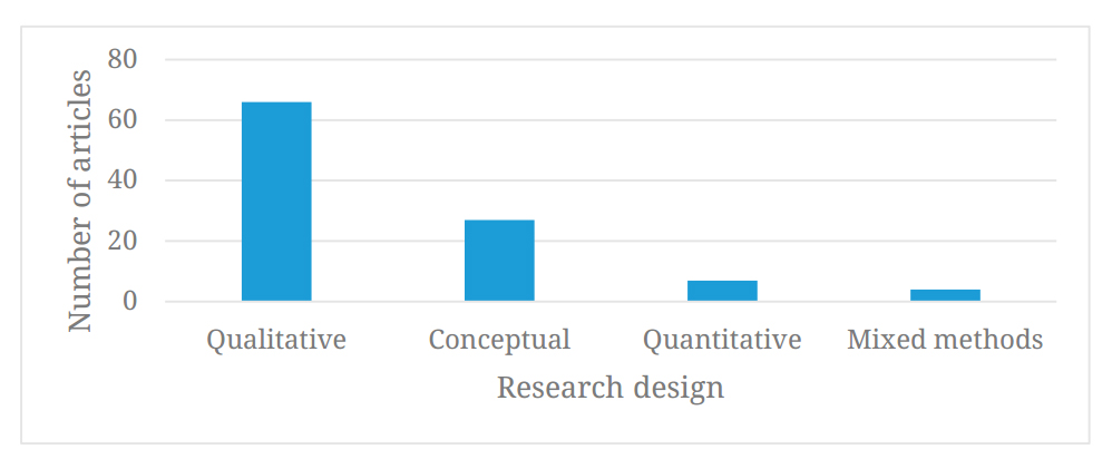 Finding 1: Strong reliance on qualitative case studies; scarcity of quantitative studies. Inevitably, a new phenomenon such as SBM draws heavily on illustrative examples, and case and interview-based studies to obtain insights into what the concept means and how it is put into practice. A total of 66 studies are based on a qualitative research design (Figure 3). Of these studies, 56 self-identify as case studies with interviews their main source of data, supported sometimes by documents. For instance, Flodén and Williamsson [60] map business models for the transport of biofuel in Sweden and offer suggestions about how these models could be applied to intermodal transport. They combine interviews with site visits to observe the SBM in practice. This type of qualitative research draws on small samples but can provide detailed and rich insights to add to our understanding of SBMs. They are valuable and there are no fundamental objections to a qualitative research design and case studies. However, to judge whether the field is maturing requires other methods that allow generalization and causalities, as will be discussed below.