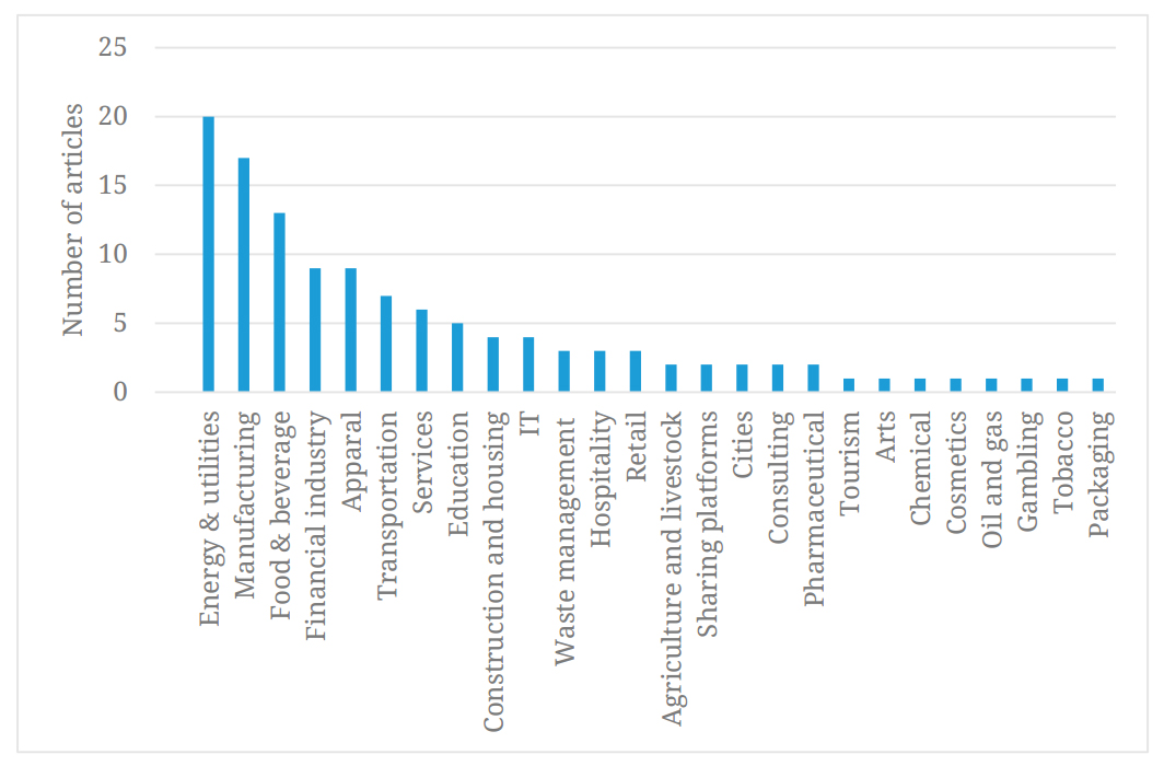 Finding 2: Dominant empirical focus on the energy, manufacturing and food sectors. In the sample of empirical papers, 79 specify the sector on which the research focused, with most studied sectors being energy, manufacturing and food (Figure 4). The focus on the energy sector can be expected in light of the relevance of SBMs in this sector. Nair and Paulose [40] investigate algae biofuel for aviation; Hellstrom et al. [38] look at distributed energy ecosystems; Gaulthier and Gilomen [44] examine energy efficiency in urban districts; and Tolkamp et al. [62] provide a study of energy efficiency services in the Netherlands. Also, while the manufacturing sector is diverse, its relevance in the context of SBMs is clear. The materials used, the high energy consumption involved in most manufacturing processes, the role of the supply chain and the pivotal position of manufacturing in recycling and circular initiatives all make SBMs particularly relevant. For instance, Stubbs and Cocklin [15] examine Interface, a carpet manufacturer which is the subject also of the paper by Rajala et al. [47] which focuses on the greening of the firm’s business model. Yang et al. [63] examine six manufacturing firms - from China, the United States and the United Kingdom to validate their uncaptured value framework in the context of for SBM innovation. Finally, the food and beverage sector is relevant due largely to the major environmental impacts of growing and producing many food products (e.g., meat) and the high levels of waste in that sector. For instance, Long et al. [49] examine critical success factors and barriers for the transition to SBMs in the sector, while Gallo et al. [64] discuss SBMs to make the chocolate industry more sustainable and Ribeiro et al. [65] adopt a SBM perspective to develop a tool to diminish waste of "ugly fruits" in Portugal.