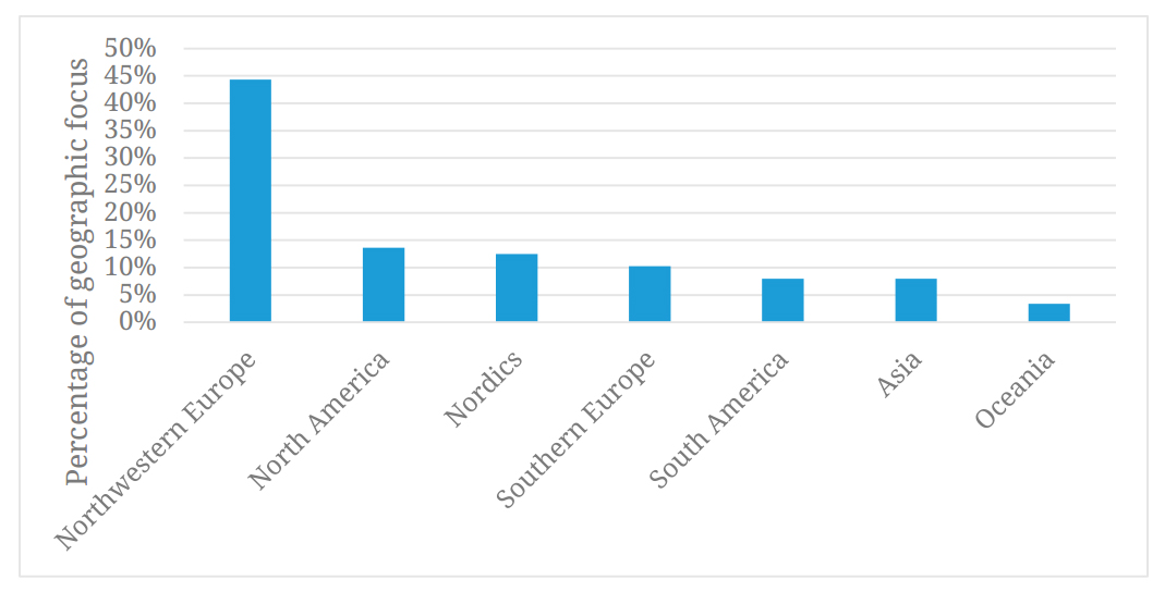 Finding 3: The empirical focus of SBM scholars is strongly concentrated on northwest Europe and the Nordic countries. The sample includes 71 articles that mention their empirical geographical of focus. In total 27 unique countries are covered out of the 88 times countries are mentioned (Figure 5). The regions referred to include northwest Europe (the United Kingdom, Netherlands, Germany, Belgium Germany and Austria) which is the scope of most of the empirical research (39 times/44%), followed by North America (12 times/14%) and the Nordic countries (11 times/13%). The geographic concentration of this research on a very specific, and relatively small part of Europe is noteworthy. Also, in the sample of journals included in this review, there are some evident ‘empirical blind spots’. Africa stands out in this regard although it is an area where arguably, SBMS would bring huge value and contribute to the continent’s development allowing it to leapfrog some western regions with less SBMs. This applies also to Asia which offers potential for benefiting from SBMs due to its huge populations, high growth-rates and large manufacturing presence. Thus, in terms of the empirical focus of SBM research, the interest in Europe is encouraging but the SBM community should widen its empirical focus and research.