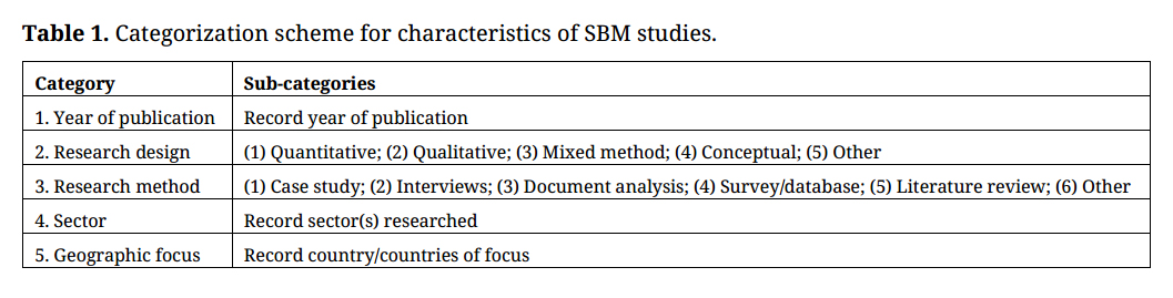 The study is underpinned by two broad initial research questions, made more specific by various sub-questions. The first main research question is “What are the dominant characteristics of SBM studies to date?” This question is broken down into the following sub-questions: