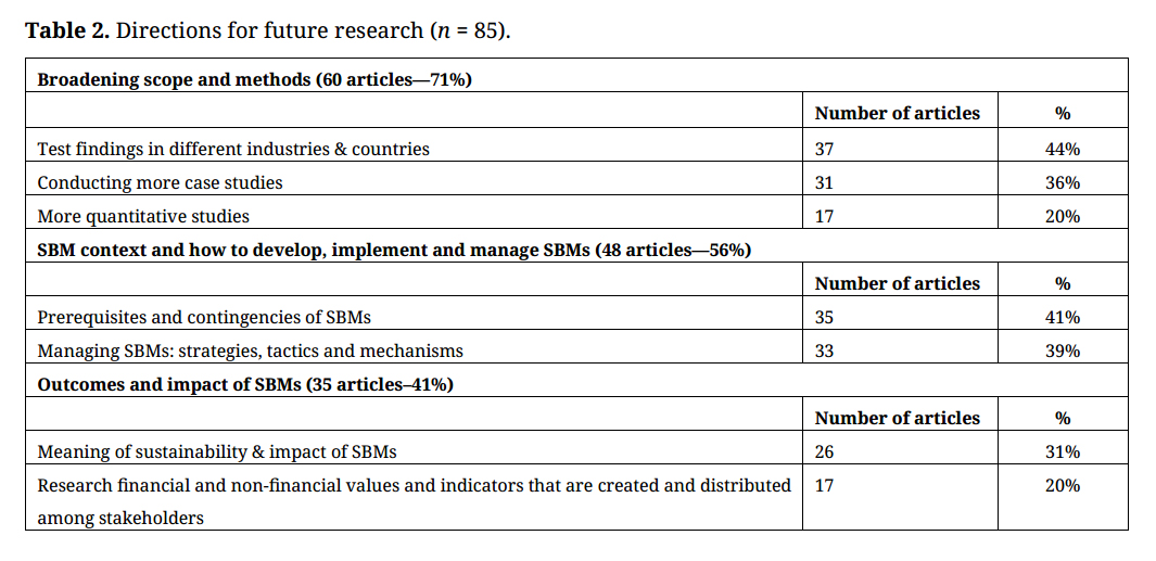 In relation to future research opportunities recommended by SBM scholars, in this paper this is formulated as a research question that is addressed empirically through a systematic analysis of the recommendations for future research sections of the studies in the sample. First, a broadening of scope and methods would be useful. In addition to the useful and insightful existing case studies, it would be informative to employ quantitative or mixed-methods to establish causalities, correlations and generalizations which are more difficult, yet not impossible, to derive from qualitative case studies. Also, expanding the empirical focus of studies to more countries and sectors could lead to a more robust understanding of the differences and commonalities of developing and managing SBMs. Second, this review shows the importance of context and the value of opening up the black-box of SBMs. Obtaining a better understanding of how these models are developed, implemented and managed by identifying successful strategies, tactics and mechanisms is vital. Exploring the prerequisites, contextual factors and ecologies of the transition from a traditional business model to a SBM also deepens the understanding of these models. Finally, rather than assuming that SBMs lead to successful organizations and a more sustainable society, scholars should investigate the outcomes and impact of SBMs. This will require scrutiny of the meaning of a SBM and when it can be deemed to be successful. Scholars should analyze both the financial and non-financial forms of value which are created or destroyed, and distributed among stakeholders by SBMs, and the indicators that can measure these forms of value.