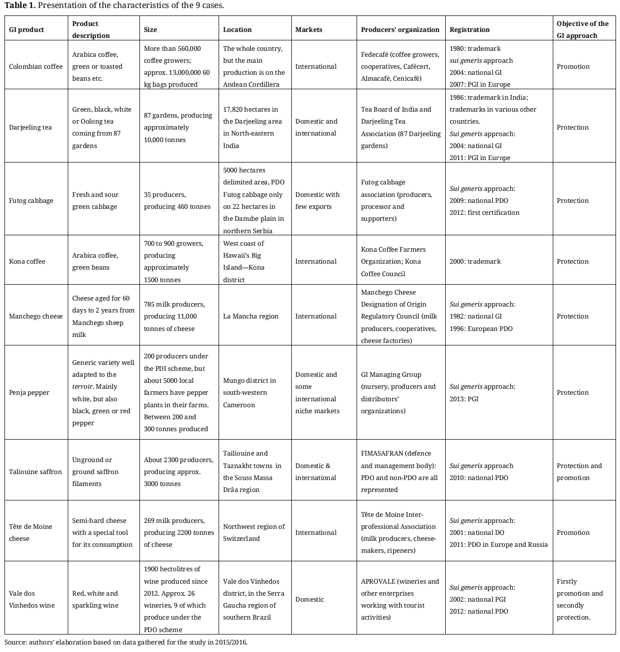 On the contrary, for the “old European” cases, Manchego cheese, Tête de Moine cheese, as well as for the Darjeeling tea and Colombia coffee cases, the legal and institutional frameworks seem to provide all the necessary functions and clear information to users, so as to protect producers and consumers in an efficient way. The fact that the GI legal and institutional frameworks are ancient has allowed stakeholders to learn collectively so to reach a fluid functioning.