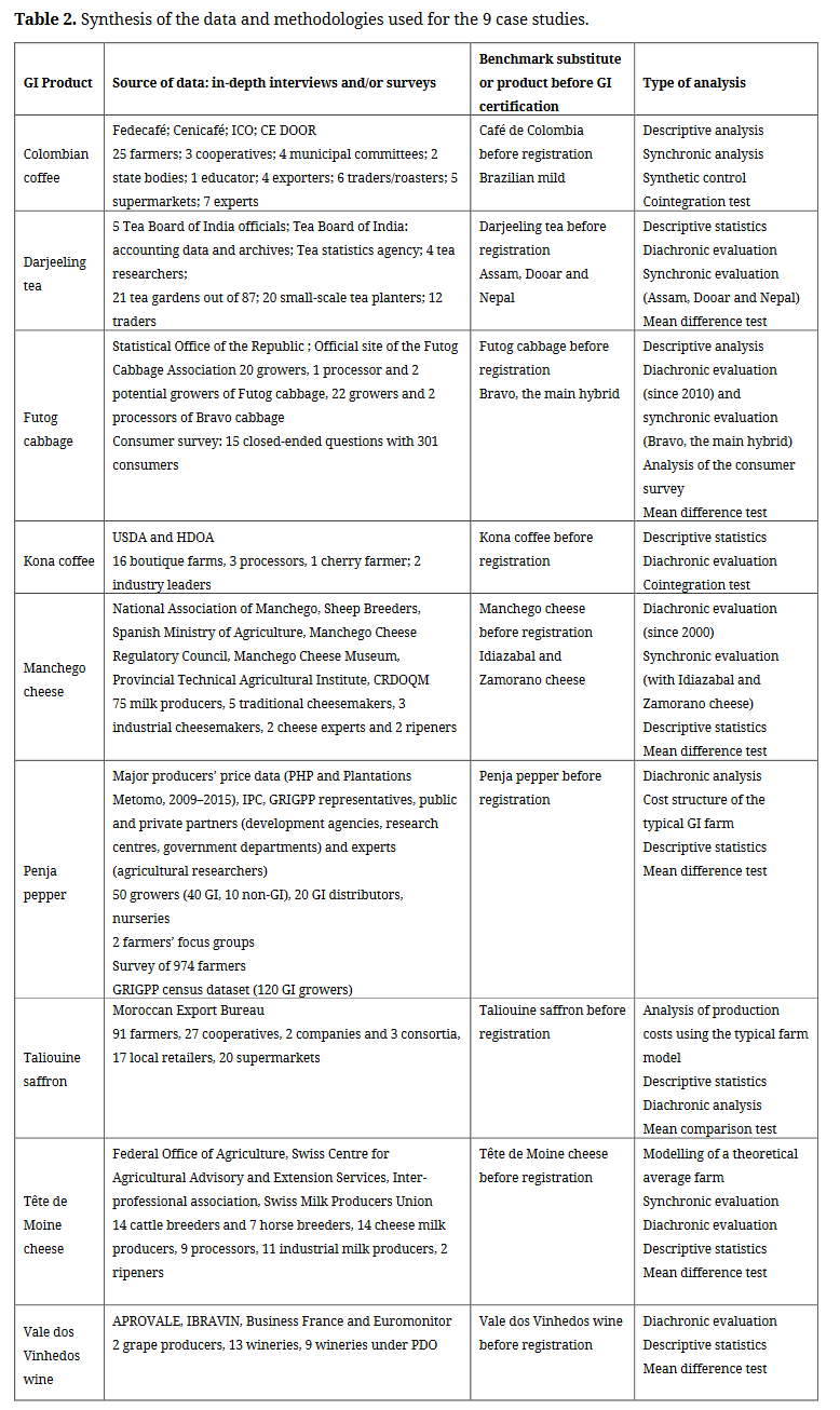 The details of this article can be found in the report: Vandecandelaere E, Teyssier C, Barjolle D, Jeanneaux P, Fournier S, Beucherie O. Strengthening sustainable food systems through geographical indications: an analysis of GI economic impacts. Rome: Food and Agriculture Organization of the United Nations (FAO) and BERD. 2018. 135p. [49].