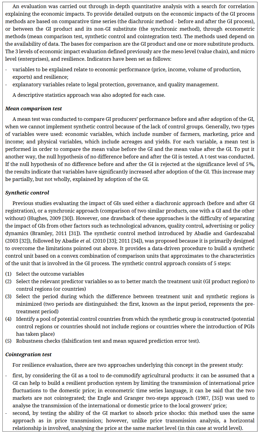 For further details, we suggest to look the report as follows: Vandecandelaere E, Teyssier C, Barjolle D, Jeanneaux P, Fournier S, Beucherie O. Strengthening sustainable food systems through geographical indications: an analysis of GI economic impacts. Rome: Food and Agriculture Organization of the United Nations (FAO) and BERD. 2018. 135p. [49].