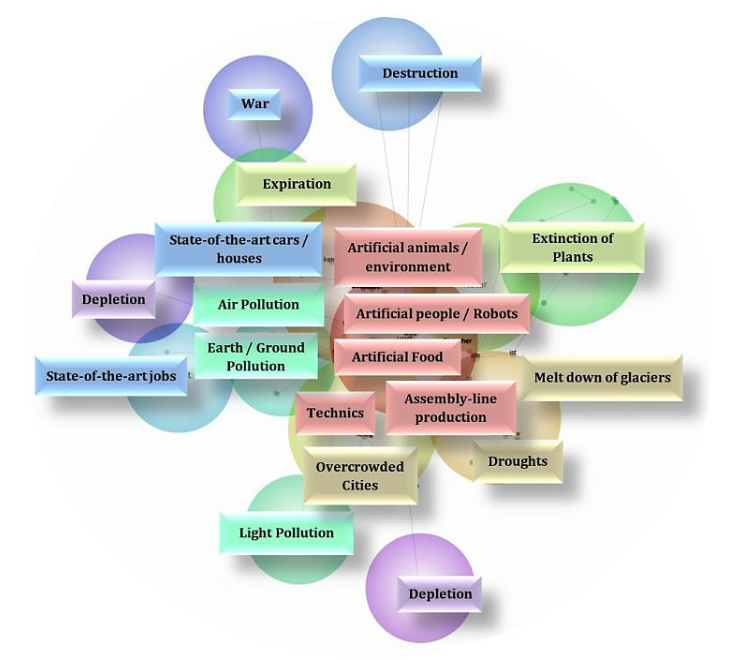 To sum up, the research setting allows a triangulation of qualitatively content analyzed research papers, transcribed and content analyzed descriptions of 73 drawings (of pupils at ages between seven and nine), and a (re-)visualization of the latter by a software-tool. In addition, Leximancer is programmed not to only count words, but to build clusters, to semantically analyze texts, so to identify pupils’ pathways regarding the context of SDGs [4], creativity in education, political freedom, sustainability, and their internal manifestation, i.e., the development of belongingness to society and nature.