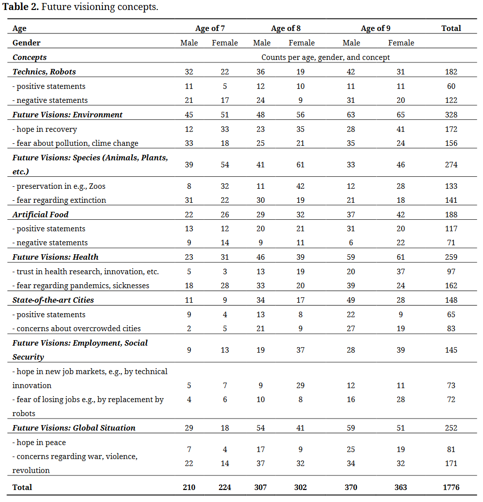 Regarding the first research aim, 73 Swiss pupils at ages between seven and nine were asked to draw a picture of their imagination “how the world looks like in 2040”. The author kept the instruction open, though “2040” might be narrowing. However, several pretests showed enhanced ST-activity regarding the description of the drawing, which is the manifestation of the pupils’ ideas, beliefs, guessing, etc. the pupils’ mind was crossed during drawing.