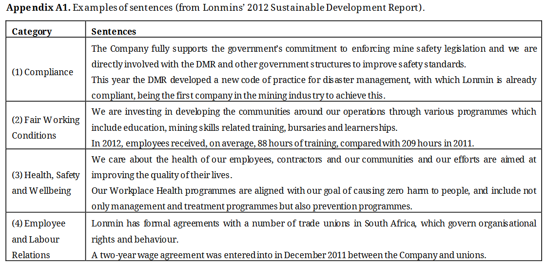 A content analysis methodology to analyse environmental and social public disclosures of Lonmin is used. Content analysis is a very common and widely used methodology [23,35,58–60] to examine annual reports, stand-alone sustainability reports and corporate website content.