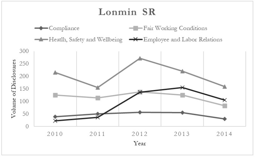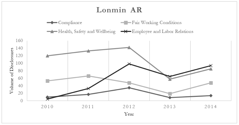 The evolution of Lonmin’s amount of disclosures pertaining to the CSR aspects examined throughout the defined timeframe is presented in Table 3. One should note that the amount of disclosures presented pertains to the four categories mentioned above, and not to disclosures concerning CSR in general. The amount of disclosures is measured as the number of sentences falling into the four categories only. Firstly, it is possible to see that the total volume of disclosures throughout the five years is more extensive in Lonmin’s stand-alone sustainability reports (SR) than in annual reports (AR). The analysis of these results led to the conclusion that, in fact, and in line with literature supporting legitimacy theory, Lonmin increased its CSR disclosures at the time of the incident: for SR and AR, Lonmin’s volume of disclosures reached its peak in 2012, with values of 604 and 323 sentences, respectively. The increase in AR was much less abrupt.
