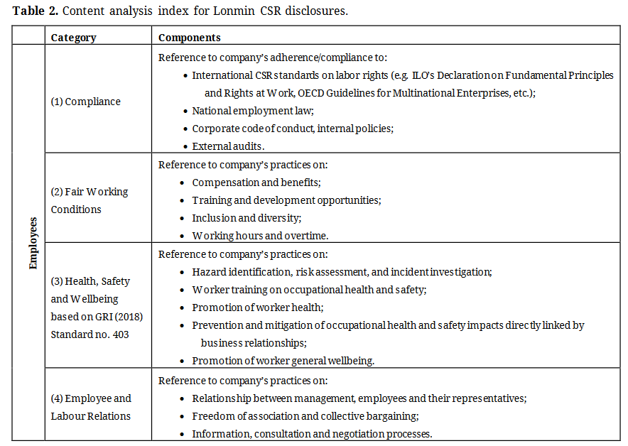 Categories were defined according to the particularities of the case and in line with what one would expect to vary in terms of volume of disclosures. Given that employees were the main affected group, Husgafvel et al. [61] approach to social sustainability performance indicators was used as a starting point to establish the categories. The four main categories, as enumerated in Table 2, are: (1) Compliance; (2) Fair Working Conditions; (3) Health, Safety and Wellbeing; and (4) Employee and Labour Relations.