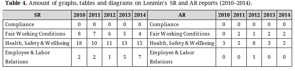 Besides the sentence count method used to evaluate CSR disclosure evolution, other type of items such as graphs, tables and diagrams were also tracked. Overall, this type of items are not used much throughout Lonmin’s reports. Unlike the sentence count method, which has registered peak values on the year of the incident, for categories “health, safety and wellbeing” and “employees and labour relations” the positive variation occurred during the post-incident interval (Period 3), for sustainability reports analysed, as illustrated in Table 4.