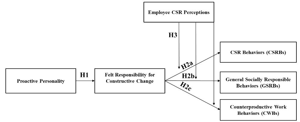 Hypothesis 1: Proactive personality will be positively related to felt responsibility for constructive change. Felt Responsibility for Constructive Change and Responsible BehaviorsLikewise, we hypothesize that felt responsibility for constructive change will predict responsible behaviors. Fuller and colleagues [14] significantly expanded the construct space for felt responsibility for constructive change by outlining the “other-oriented” nature of employees measuring high on this construct (p. 27). They strengthened Morrison and Phelps’ [15] arguments that, in addition to behaviors directly advantageous for the organization, felt responsibility would lead to constructive workplace behaviors that target supra-organizational interests, such as those of external stakeholders. Despite these theoretical assertions, both Morrison and Phelps [15] and Fuller et al. [14] principally focused on how felt responsibility influences employees’ desire to improve organizational efficiency and effectiveness. We contend this is an incomplete representation of a wider readiness for creating positive change that is both similar to and distinct from proactive tendencies alone [11,22]. To test this proposition, we consider three forms of socially responsible behaviors not previously studied in this context: Employee CSR behaviors, general socially responsible behaviors, and refraining from counterproductive work behaviors. We make a distinction between these variables in order to capture individual behaviors that would be associated with CSR as it is more traditionally defined, as well as behaviors beyond the bounds of CSR initiatives—both at work and beyond. We also do this to capture responsibility as manifested in both approach (e.g., help conserve energy) and avoid (e.g., refraining from participating in unethical acts) behaviors.