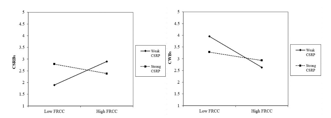 Hypothesis 3: CSR perceptions will negatively moderate the effect of felt responsibility for constructive change on corporate social responsibility behaviors, such that the effect of felt responsibility for constructive change on CSRBs will increase as perceptions of CSR weaken.Although not hypothesized, we also include in our model a moderation path from employee CSR perceptions on the relationship between felt responsibility and both GSRB and CWB. This again will allow for contrasts to more robustly test our theoretical position. Whereas we expect CSR perceptions to moderate felt responsibility’s effect on CSRB, it may not moderate felt responsibility’s effect on GSRB and CWB. That is, the situational norms created by CSR would be expected to more strongly constrain felt responsibility’s effect on behaviors specific to CSR as compared to pro/antisocial behaviors in general.