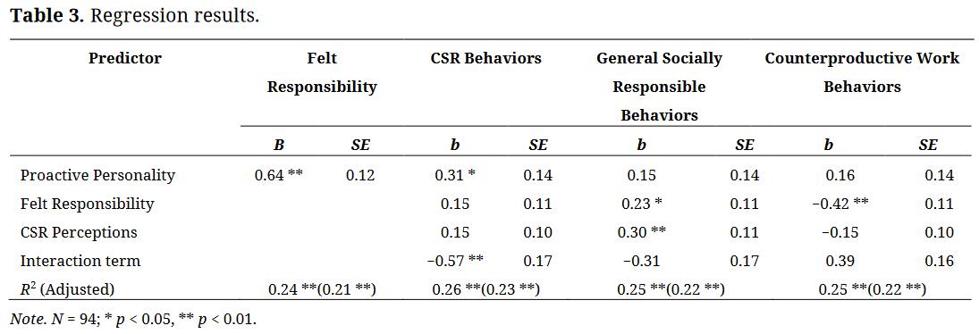 Contribution to TheoryThis research integrates the CSR and personality/responsibility literatures, positioning CSR as a topic well-suited for study within the broader responsibility literature. Building on prior scholarship on felt responsibility for constructive change and strengthening claims behind proactive personality (an important antecedent of felt responsibility; [14]), the moderated mediation effects found for CSRBs and CWBs supports the contention that felt responsibility for constructive change is narrower in scope than proactive personality, in that the former seems to better capture proactive change-oriented behaviors in the workplace, while necessarily preceded by the latter [13]. To our knowledge, this is the first study that tests either construct in this way within an actual workplace setting. These findings also show that felt responsibility can predict responsible behaviors directed toward third parties outside of the company and repress CWBs – something that has previously only been suggested for proactive personality.