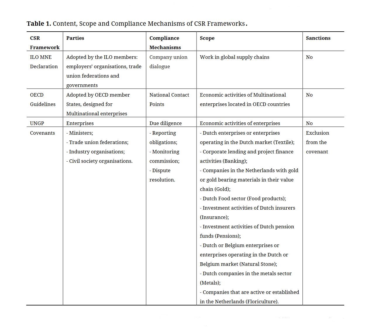 On the basis of this diagram we can conclude that the parties differ, the compliance mechanisms differ and the scope differs, but that the aim is the same: regulating the supply chain. None of the compliance mechanisms constitutes a legally enforceable obligation, but all are intended to achieve voluntary compliance through forms of mediation. Sanctions are lacking, as is the opportunity to claim damages. All in all, the frameworks discussed regulate the supply chains in a non-obligatory manner. With regard to the covenants, the question of whether this approach is effective is discussed in Section “Effectiveness of CSR Frameworks” below.
