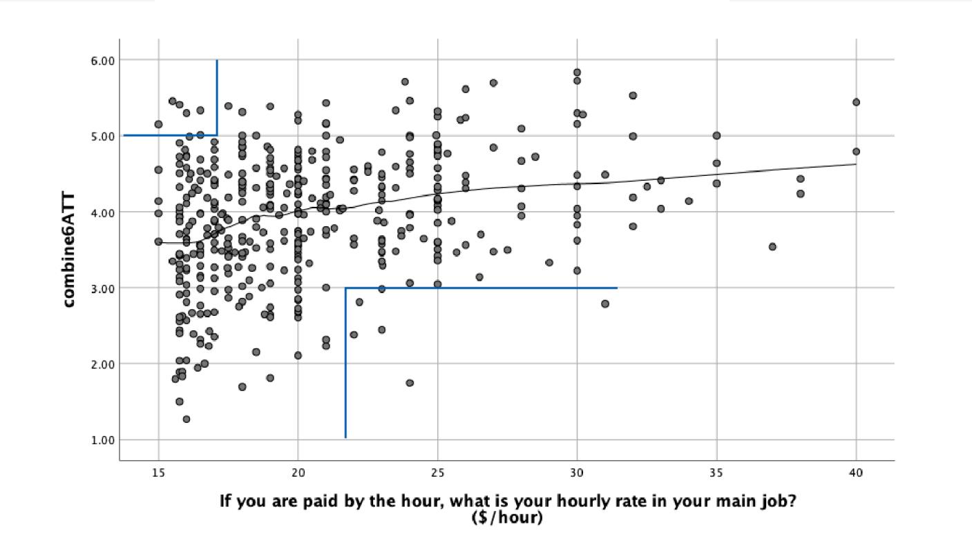 Based on the potential informativeness of outlier cases, we decided to expand our analyses to include two types of outliers: relatively low wage but high job attitude scores and relatively high wage but relatively low job attitude scores. A series of steps then were undertaken to identify the potentially informative case outliers. First, we followed Fisher [20], who argued that attitude scores often reflect different facets of happiness at work. Carr et al. [8,14] too found that the primary cusp in pay-attitude curves tends to occur at the same point regardless of specific job attitude, suggesting that those curves also reflect underlying happiness at work.