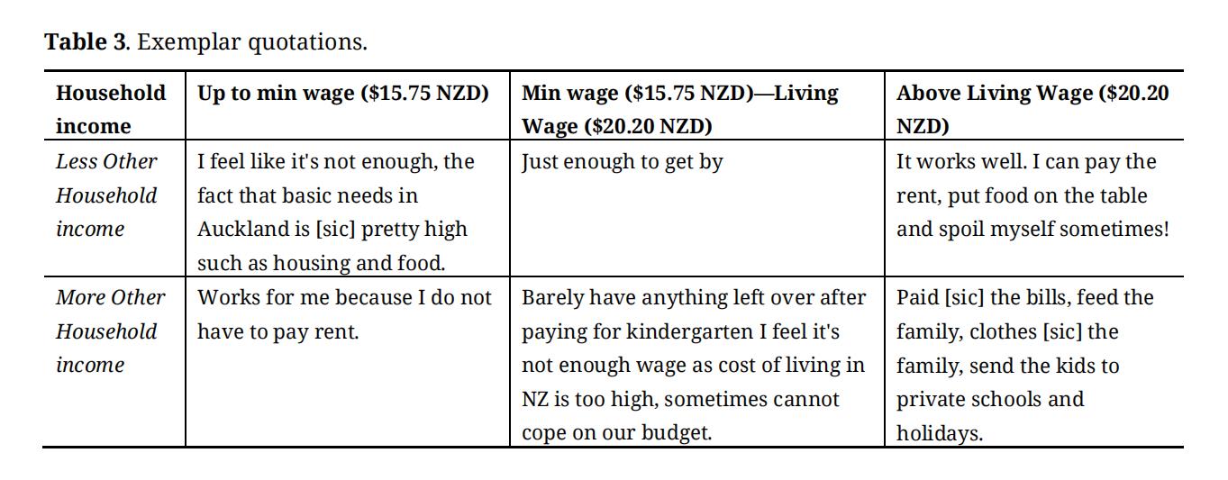 Such consequences from low-waged work clearly go beyond job attitudes themselves by traversing into wider work-life balance [15]. According to Haar and colleagues [16], in theory low wages can spill over into everyday quality of living. Our first objective in this study was to explore this possibility empirically. Based on the work of Haar et al. [15,16], we expected to find that qualities of living spontaneously reported by participants would transform from negative to positive as the participants' hourly pay crossed a Living Wage threshold. The precise ways in which household composition interacts with such spill-overs remain under-researched and poorly understood [8]. In this study, we expanded on Carr's and colleagues’ [8] study with a second objective to consider if and how low wages may have interacted with added household income streams and number of household dependents not employed in paid work.