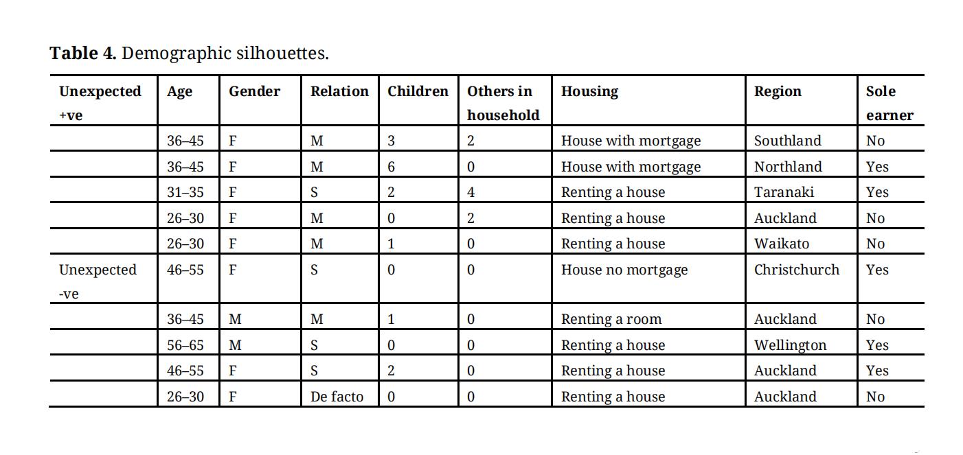 As the data in Table 4 show, the participants in the unexpectedly positive group were younger and all female, with more children/dependents in the household (total of 20 compared to 3 in the other group). Four out of five lived outside of the main urban areas (main urban areas = Auckland, Wellington, Christchurch). In comparison, all of the participants from the unexpectedly negative group lived in the three biggest agglomerations (Auckland, Wellington and Christchurch). In these three cities, housing costs were highest (Table 4). Such points of comparison, even in such a small sub-sample, suggest that higher urban housing and living costs may have dampened any fillips from higher hourly pay whilst lower living costs may have worked in the opposite direction by buffering any deleterious effect on happiness levels from lower levels of hourly pay.