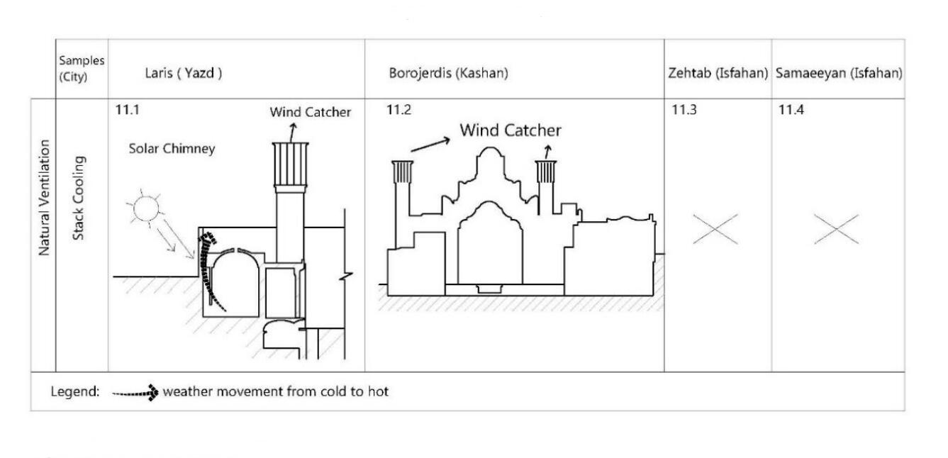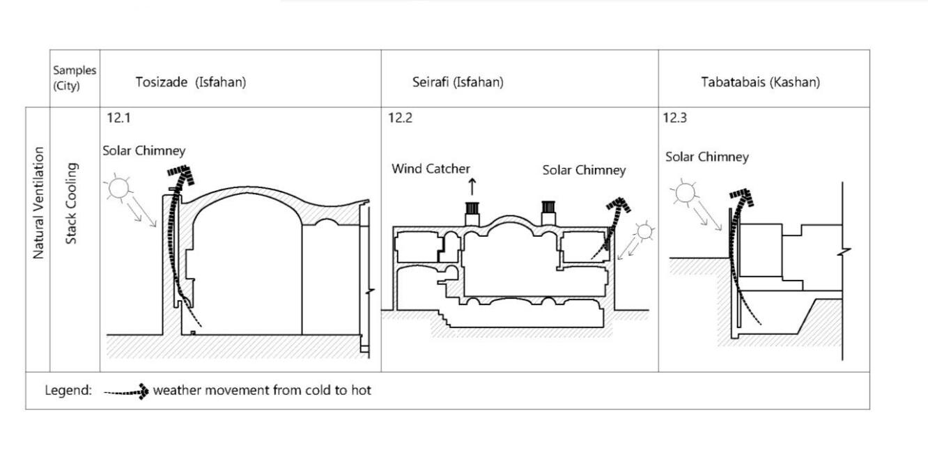 Stack coolingCooling interior spaces was achieved by using passive stacks on hot summer days, providing a vertical exhaust path for the hot air. Further, ventilation towers (also known as solar chimneys and wind catchers) helped the building fabric to cool down during the night, owing to their thermally massive structures [43].