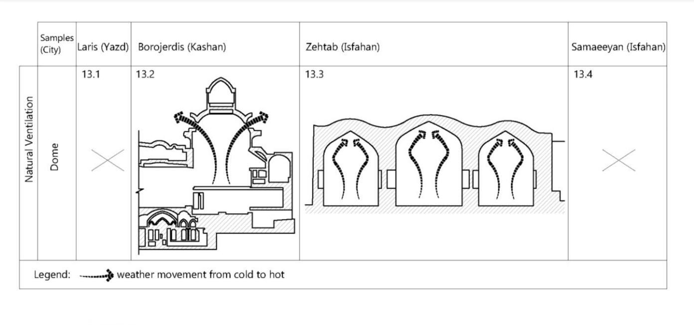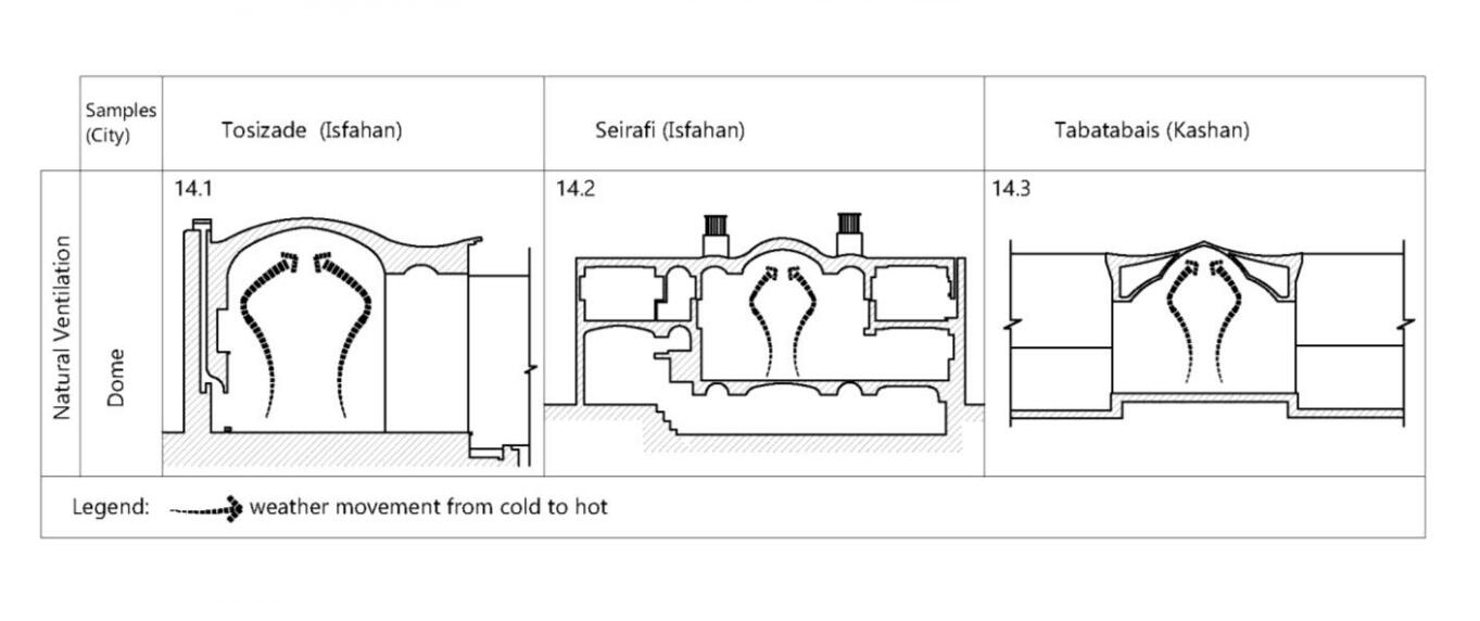 DomesDomes are one of the major elements of Iranian traditional structures, including residential buildings [44,45]. Five out of the seven houses have a dome designed to assist in passive cooling (Figures 13 and 14). This architectural element provides additional space for the heated air to move up to the ceiling, driving the cool, fresh air to enter from openings on the walls adjacent to the central courtyard. In the Borojerdis house (Figure 14.1), there were openings on the dome’s surface that guided the hot air out of the building. Domes also increase the shaded area on ceilings in comparison with flat ceilings, decreasing the overall heat trapped in the thermal mass by solar radiation.