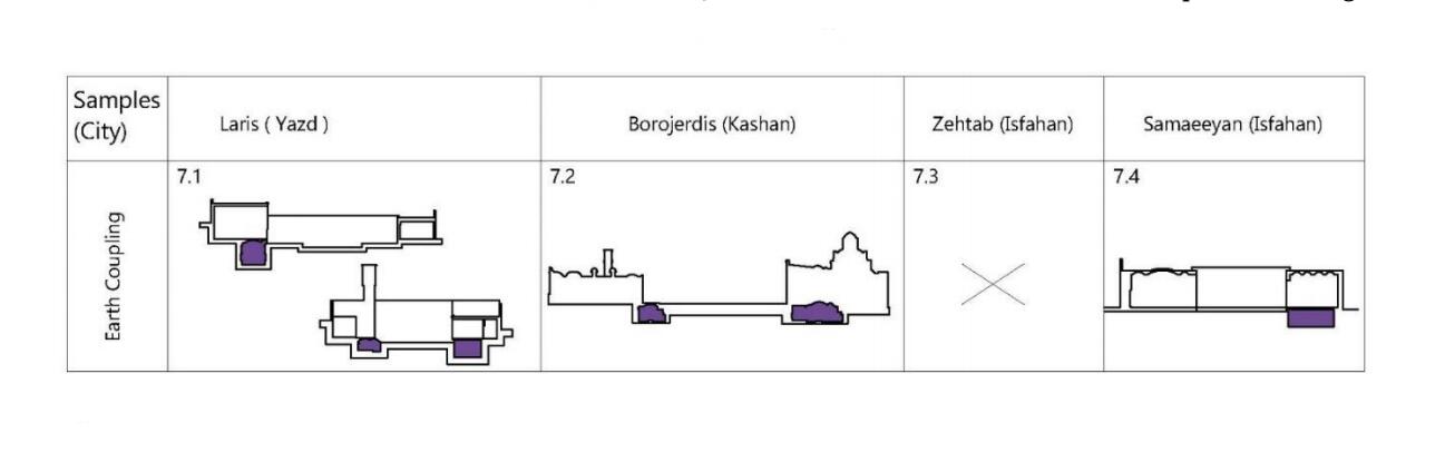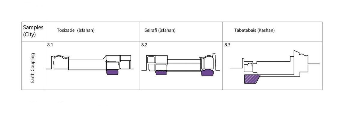 Earth couplingIn hot and dry climates with mild winters, the cool temperatures of the soil can provide passive cooling to the earth-covered parts of a building [35]: “In regions with a temperate climate, the natural temperature of the soil in summer at a depth of 2–3 m may be low enough to serve as a cooling source” [35]. In the traditional houses of Iran’s hot and dry regions, some rooms were built six to seven metres below the ground surface, where there is usually a steady annual temperature [6]. Empirical investigations showed that “these spaces can provide substantially cooler indoor temperatures in summer” [25]. This method has been used in Figures 7 and 8 except in the Zehtab house.