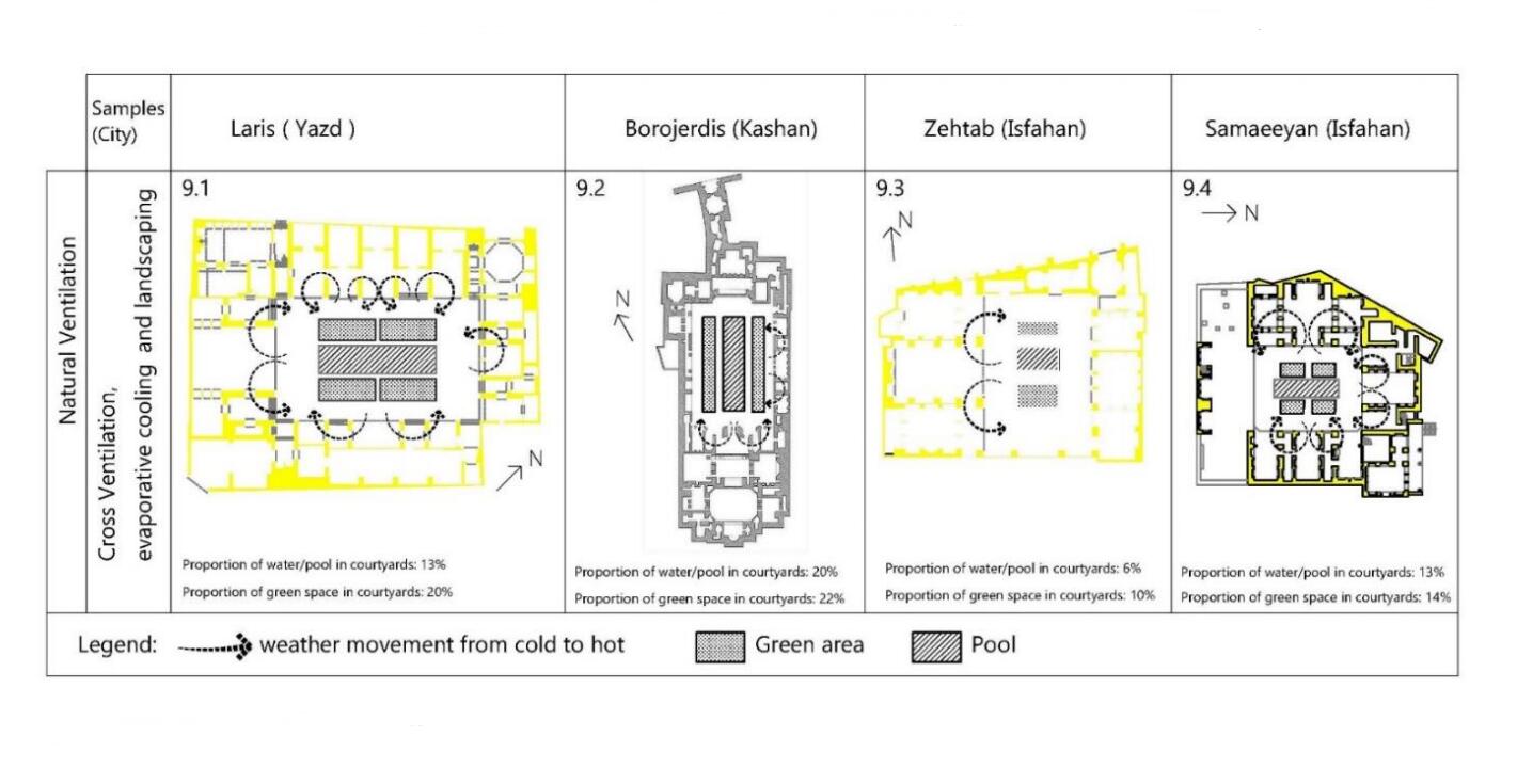 Further, natural ventilation was used as a passive method for air circulation around the house to reduce energy consumption for cooling. Multiple openings on the courtyard-facing walls were seen in all the case studies. Although these openings were not on opposite sides of each room, multiple openings on the same wall could still facilitate the natural ventilation. In addition, openings oriented towards the prevailing wind facilitated night purging in most of the case studies. Shallow pools occupied 4% to 20% and green spaces 10% to 30% of the courtyard areas in the studied houses, both of which facilitated evaporative cooling. Stack cooling through wind catchers and solar chimneys and domes were other features used in 70% of the case studies. Regardless of the fact that whether contemporary housings have a courtyard or not, the natural ventilation strategy is still applicable. Natural ventilation is mainly driven by the correct positioning of the openings in walls which is easily addressed at the design phase of the buildings.