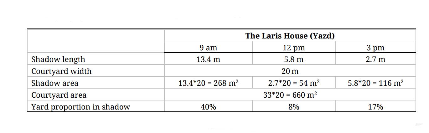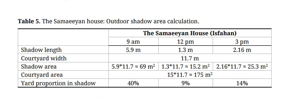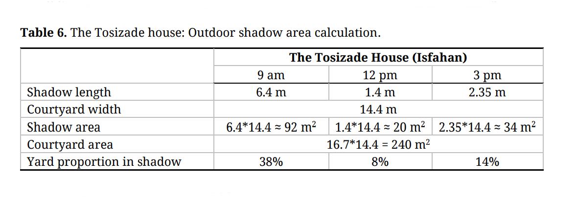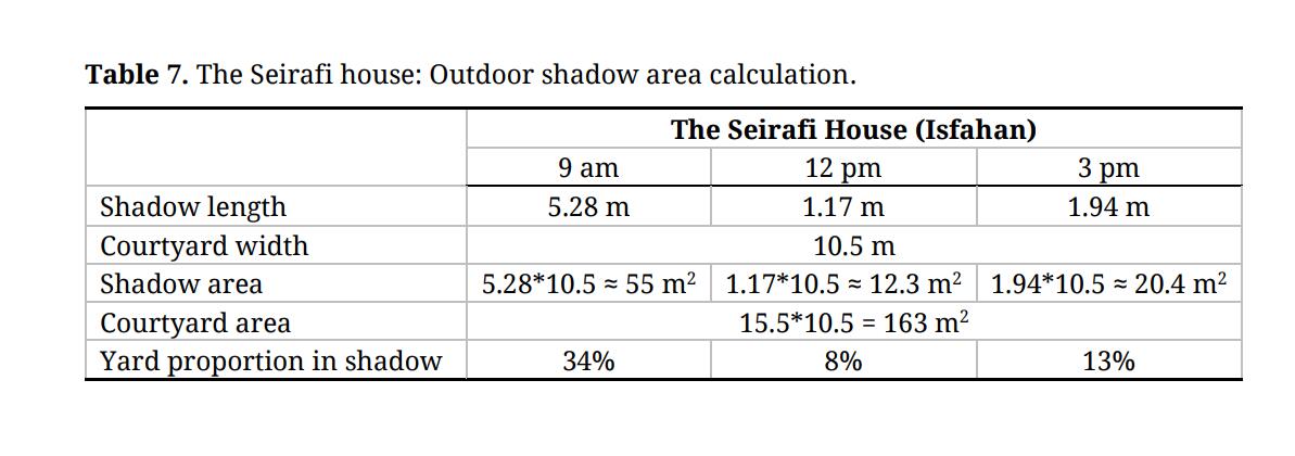 The findings indicate that taller walls on the south side of the courtyards provided expanded shaded areas and created thermally comfortable outdoor spaces for residents. For example, out of all seven studied houses, Tabatabais house had the tallest (13.75 m) north-facing wall in the courtyard, with the largest proportion of yard in shadow (49% at 9 am and 18% at 3 pm). Conversely, Seirafis house had the shortest (3.44 m) north-facing wall in the courtyard, providing the smallest proportion of yard in shadow (34% at 9 am, and 13% at 3 pm) among all the other houses. Therefore, this study suggests designing tall walls on the south side of the courtyards in northern hemisphere is a passive cooling strategy that contributes to the thermal comfort of the residents. This strategy is one of the most practicable passive solutions that can be incorporated in contemporary housing design. It is suggested that this strategy needs to be considered in building codes and regulations considering the geography and context of the building site.