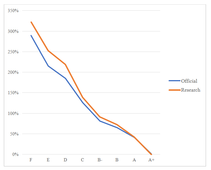 The outcomes indicate a negative deviation from the official, higher-margin targets, the “F” to “C” labels. On its statistical web page, the ADENE reveals that grades under “C” represent older buildings built before 1990: usually, a sample with less technical information on specifications to assure the performance assessment. As the study and the legislation suggest, this condition leads the assessors to use “Simplification Rules” based on a favorable review rather than a negative. The negative variation of 22.45% does not necessarily reveal the tendency to push for a higher letter, per 50% range, although upgrading those close to the threshold is possible. Nevertheless, it builds up an overall erroneous ranking, leveraging the older buildings (<1990) rate, primarily upon passive elements with higher impact in the opaque envelope, due to the impossibility to gather inner evidence, as isolation presence.