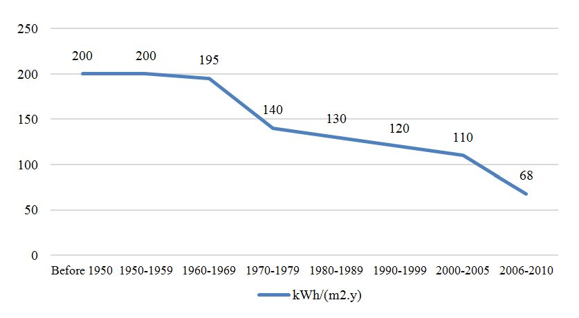 Chart 3. Average final consumption levels for heating (kWh/(m2.year)) of single-family homes by year of construction in Portugal [24].