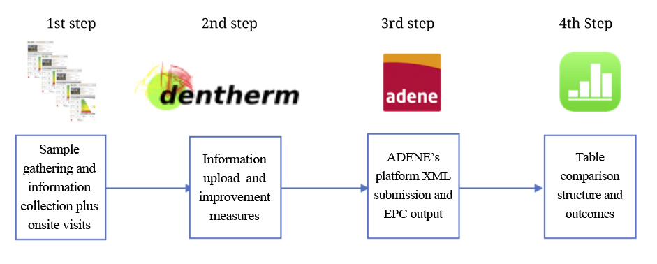 The third step had three phases. In the first, the author uploaded the building data requested only resorting to standard solutions, as enforced by the “Simplification Rules” when lacking technical documentation, when it was impossible to confirm evidence on-site to calculate parameters. In the second phase, proceed by selecting the same official EPC improvement measures to assure the balance and isolate the label deviation and surveyed information quality. The research process focuses on the information survey and not the proposed improvement measures. The third phase proceeds by exporting the XML file generated by the Dentherm uploaded to the ADENE's webpage to obtain the research-made EPC; the layout differences resume watermarking, translating the lack of paid fees.