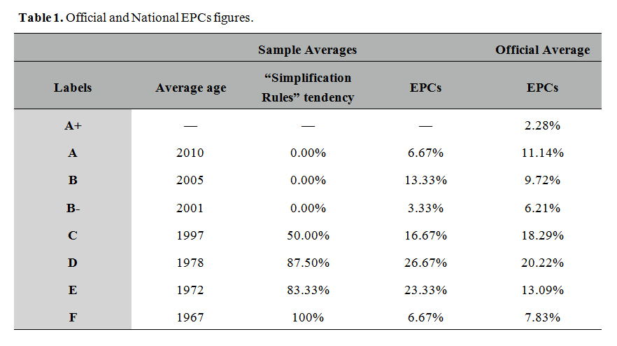 Table 1 systematizes the sample’s official figures, which align with the EPCs’ labels’ national average. The construction age shows lower EPCs labels following higher “Simplification Rules”, translating the difficulty in collecting tangible documentation to clarifying performance, as shown in Supplementary Table S1.