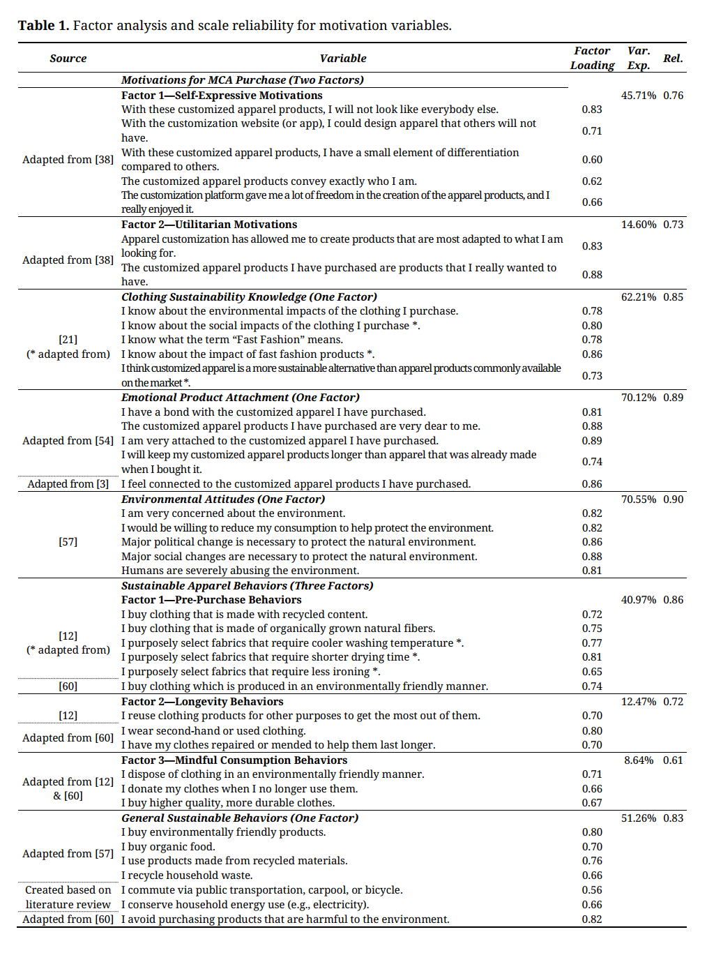 The self-reported survey took approximately 10 minutes to complete and consisted of sections related to respondents’ previous MCA purchases as well as the six variables of interest. All major variables were modified and developed based on previous literature and assessed using multi-item scales drawn from or created based on the literature review and measured with 7-point Likert type scales using 1 = strongly disagree, 7 = strongly agree for value and attitude measures, and 1 = never, 7 = always for behavioral measures. Items for motivations for MCA purchases were adapted from Merle et al. [38]; items for clothing sustainability knowledge were modified from Preuit [21]; emotional product attachment items were adapted from Mugge et al. [54] and Park & Yoo [3]; environmental attitude items were from Trivedi et al. [57]; items for sustainable apparel behaviors were from or adapted from Cho et al. [12] and Razzaq et al. [60]; and general sustainable behaviors were measured with items modified from Cho et al. [12], Razzaq et al. [60], and Trivedi et al. [57] or created based on a review of the literature. Demographic information (i.e., age, education, gender, and income) was also collected.