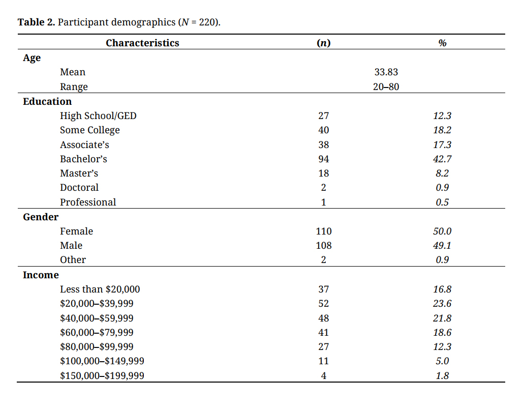 A total of 220 participant responses were included in the final analysis. The average age was 33.83 years old (median 32), with a range of 20–80 years of age (see Table 2). Specifically, genders in the sample were represented equally, with 50.0% female participants (n = 110) and two participants identifying as non-binary. Approximately 43% of participants held a Bachelor’s degree, and approximately 45% of participants reported an income between $20,000 and $59,999. The sample population was representative of the U.S. population in regard to gender distributions but differed in that the median age was younger (sample pop. = 32; U.S. pop. = 38.3); the sample overrepresented Bachelor’s degrees (sample pop. = 40.2; U.S. pop. = 20.2%) and underrepresented High School/GED diplomas (sample pop. = 12.3%; U.S. pop. = 27.0%); the income of the sample population overrepresented individuals making less than $20,000 annually (sample pop. = 16.8%; U.S. pop. = 6.8%) and underrepresented individuals making more than $100,000 annually (sample pop. = 6.8%; U.S. pop. = 16.3%) [77].