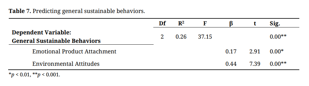 The next regression model addressed RQ#4 with general sustainable behaviors entered as dependent variable and emotional product attachment and environmental attitudes entered as independent variables. The overall model was significant (R2 = 0.26, F = 37.15, p < 0.001) and results indicated emotional product attachment and environmental attitudes positively influenced general sustainable behaviors (β = 0.17, t = 2.91, p < 0.01; β = 0.44, t = 7.39, p < 0.001, respectively). See Table 7.