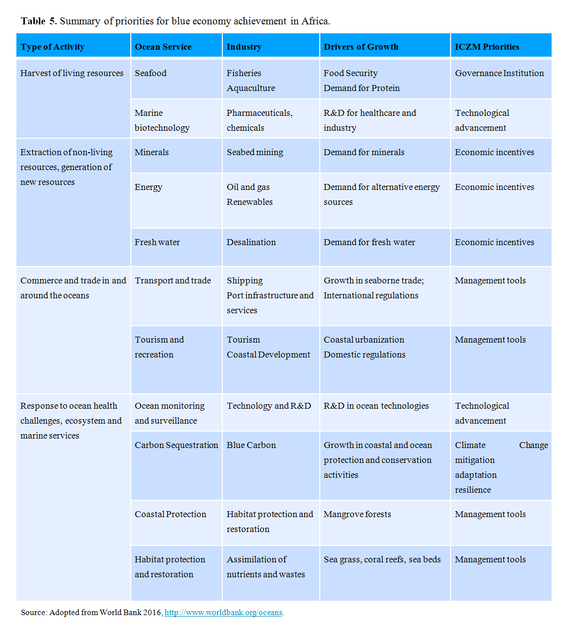 For instance, Blue Economy policies should account for the Nationally Determined Contributions of ‘blue carbon’, the CO2 sequestration by mangroves, seagrass beds, mudflats, and other coastal ecosystems. To do so requires establishing specific accounting mechanism as shown in Table 5 below for blue carbon and other ecosystem services that monitor and measure the evolution of the contribution of coastal ecosystems to carbon sequestration necessary for blue growth. The Table 5 below highlights type of activities associated with the services from oceans with linkages to the industry, drivers for growth and identified priorities.