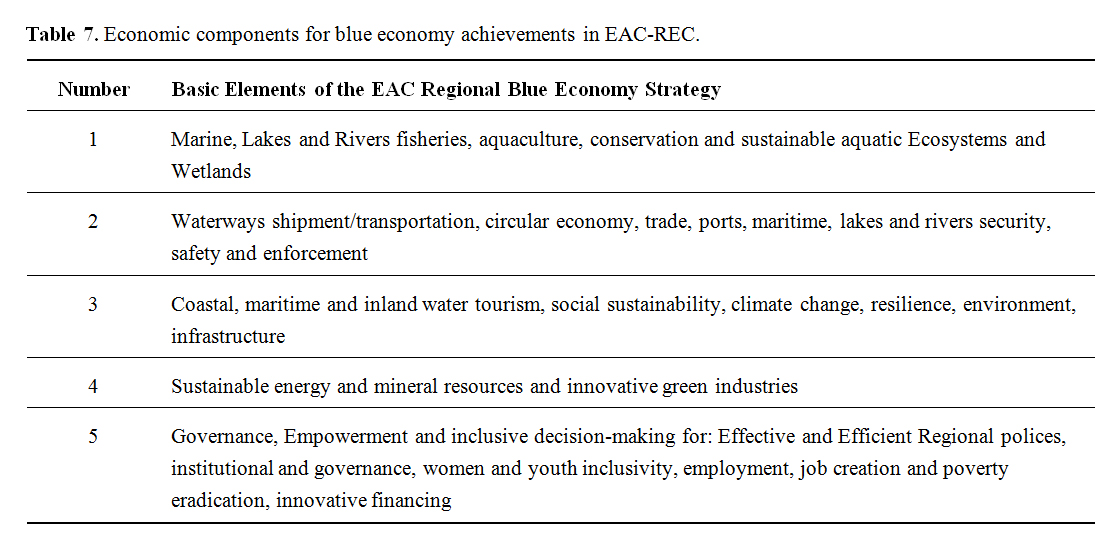 RECs Blue Economy StrategiesThe EAC-REC comprises of Tanzania, Kenya, Uganda, Rwanda, Burundi, and South Sudan. These countries are endowed with water bodies, including lakes, rivers, and underground water, in addition to the coast and marine of Kenya and Tanzania and Lake Victoria, Lake Tanganyika and Blue Nile River with unique potential opportunities and resources for economic exploitation. The largest sectors of the current EAC REC aquatic and Blue Economy are fisheries, aquaculture, tourism, transport, ports, coastal mining, and energy. The EAC REC Blue Economy exhibits inter-connectedness with other economic sectors, is responsive to emerging and frontier sectors, and with opportunities to support important social components, such as gender (women and youth) mainstreaming, food and water security, poverty alleviation, wealth retention, and jobs creation. Hence, the EAC-REC Blue Economy can play important role in the region’s structural transformation [13]. The EAC-REC region Blue Economy will contribute to sustainable use, management and conservation of aquatic and marine ecosystems and associated resources. It will build on principles of equity, low carbon footprint, resource efficiency, social inclusion and broad-based development, with the jobs agenda at the centre of it all. It will be anchored on strong regional cooperation and integration, considering structural transformation as an imperative for EAC-REC’s development. The Table 7 below shows how the EAC-REC Blue Economy strategy will establish linkages to other sectors of the regional economy, it will locate the aquatic and marine economies as part of integrated ecosystem services based on the harvesting of living and non-living resources, benefitting both costal, inland and landlocked countries. The Technical Assistance for the Development of EAC-REC Regional Blue Economy Strategy support contains the following Regional Economic Components shown below in Table 7.