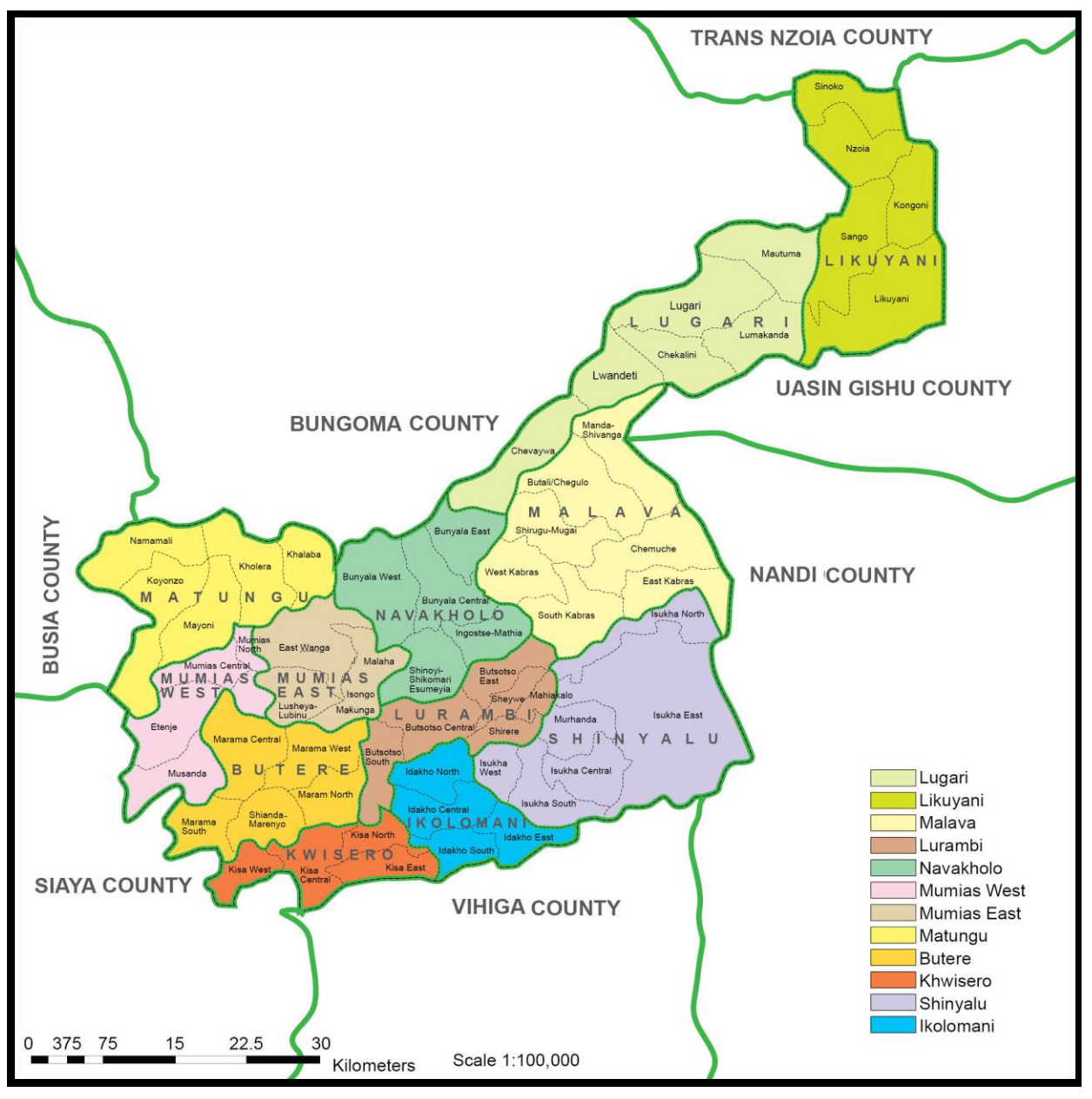 Kakamega County, located in western Kenya, covers an area of 3051.3 square kilometers. The county has an estimated population density of 682, with fewer males (48%) than females (52%). The population is projected to grow by 2.5% per annum. The county is divided into 12 sub-counties, 60 wards, 187 village units, and 400 community administrative areas. Politically, it comprises 12 constituencies and 60 wards [56]. The location map is shown in Figure 1.