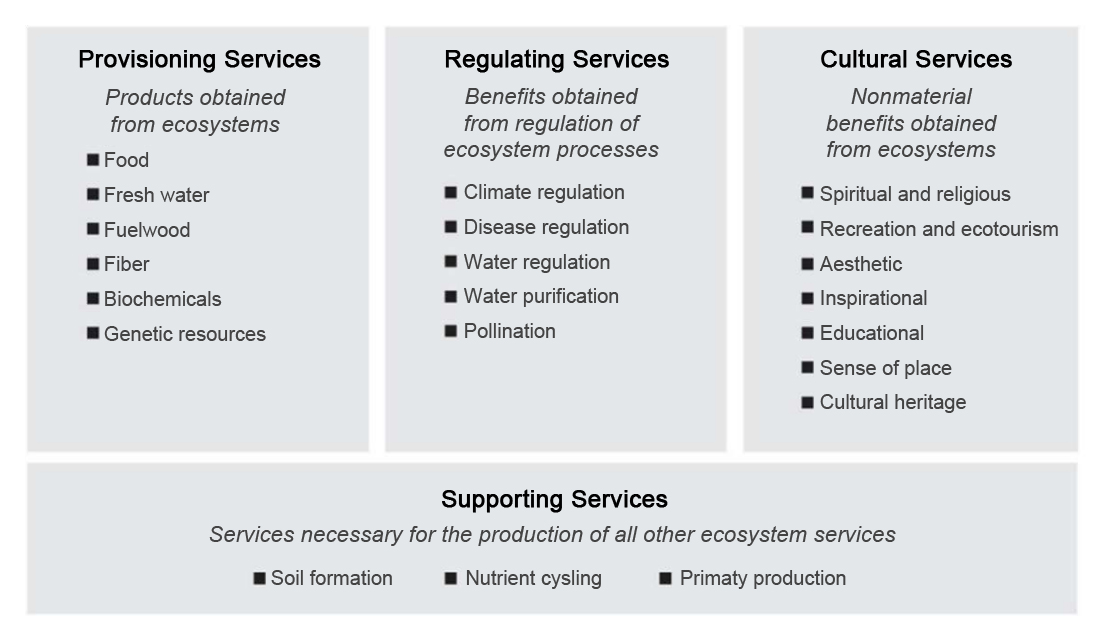 The survey questionnaire generated both qualitative and quantitative data used in this study. The qualitative aspects evaluated included the demographic attributes of respondents, their perception of ecosystem services generated by agroforests, and ways to improve the sustainable provision of ecosystem services for sustainable development, as shown in Supllementary File 1: Key Survey Questions Asked in Kakamega County. Ecosystem services were explored by adopting and customizing the framework for evaluating ecosystem services as developed by the Millennium Ecosystem Assessment Report of 2005, where four categories of ecosystem services (provisioning, supporting, regulating, and socio-cultural) were identified (Figure 2). These broad categories are also divided into specific ecosystem services, as shown in Figure 2.