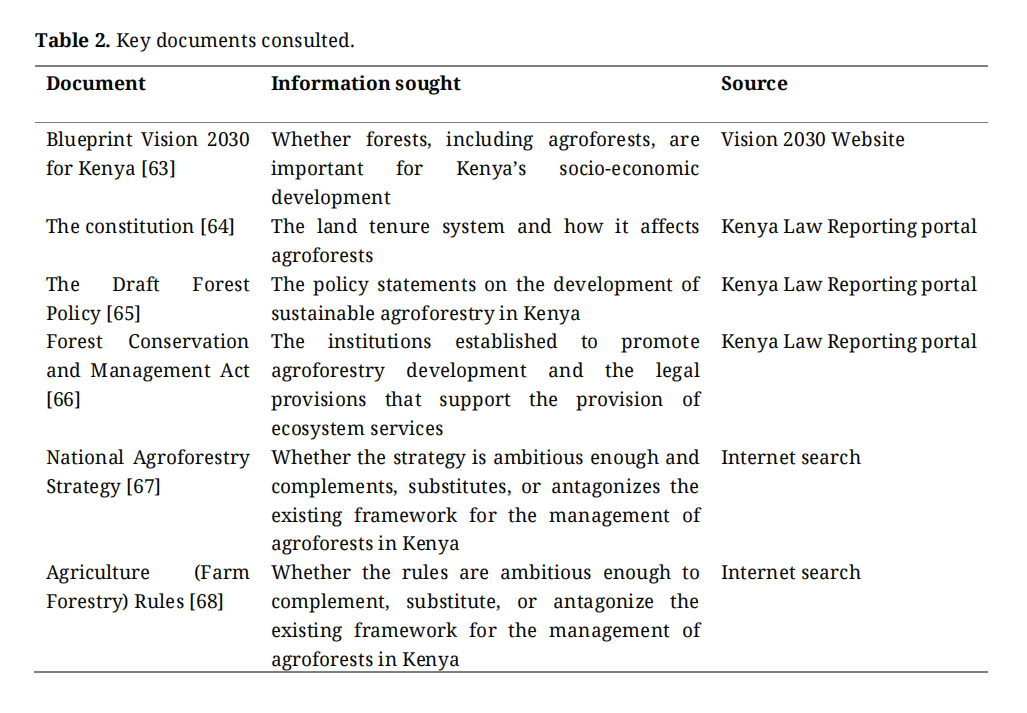 Secondary data were collected using a literature review that assessed key documents and Internet searches on official websites. The secondary qualitative data collection entailed an in-depth document review targeting the country’s key development policies and documents, as summarized in Table 2. This study determined whether these policy documents provided adequate anchorage for exploring ecosystem services from agroforests in Kenya.