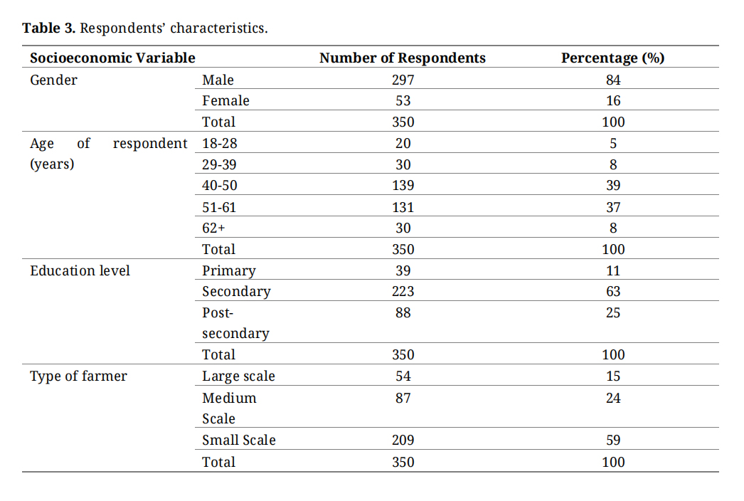 The study achieved an 87% response rate after 350 survey questionnaires were completed and returned. The general respondent characteristics are shown in Table 3. Most households surveyed were male-headed (84%), with those in the age bracket 40–50 years dominating the survey at 39%. Most respondents were fairly educated, with 63% recording secondary education. Most farmers were small-scale farmers, and 59% of the total respondents were contacted.