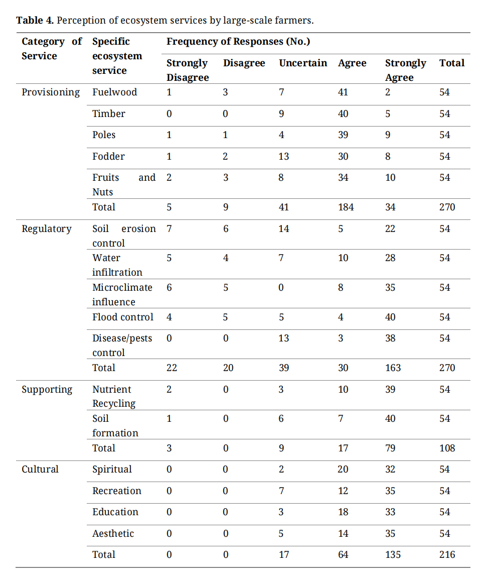 Table 4. Perception of ecosystem services by large-scale farmers.