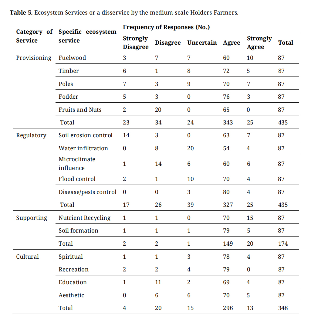 Table 5. Ecosystem Services or a disservice by the medium-scale Holders Farmers.