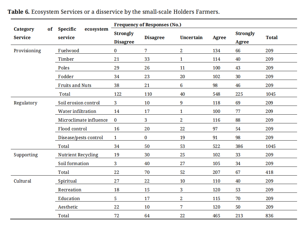 Table 6. Ecosystem Services or a disservice by the small-scale Holders Farmers.