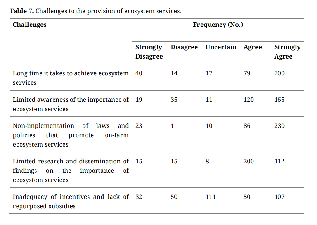 The respondents’ beliefs regarding the greatest challenges facing the sustainable delivery of ecosystem services from agroforests are summarized in Table 7. The data shows that the biggest challenge to the provision of ecosystem services was the “non-implementation of laws and policies that promote on-farm ecosystem services”, followed by “limited awareness of the importance of ecosystem services”.