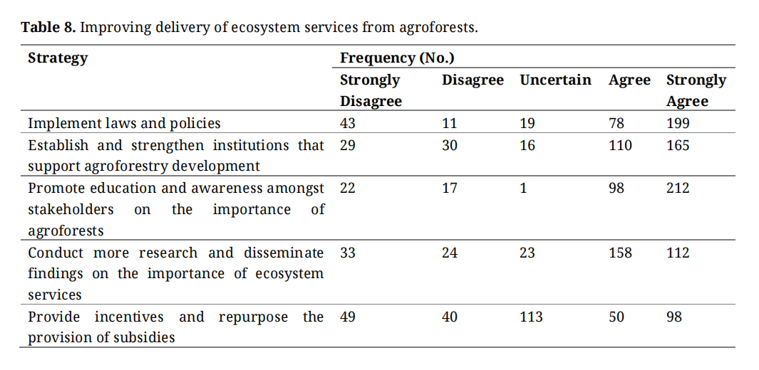 The farmers’ perceptions regarding the improvement of the delivery of ecosystem services from agroforests are shown in Table 8. The data shows that the strategies investigated ranged from implementing laws and policies to promoting research and enhancing education and awareness of the importance of ecosystem services generated by agroforests. Promoting education and awareness of the importance of ecosystem services provided by agroforests was the most favored strategy among the farmers (88.57%), whereas providing incentives and repurposing agricultural subsidies was the least favored strategy (42.9%). Implementation of national laws and policies supporting agroforestry development was ranked second (79.14%), and establishing and strengthening institutions that promote agroforestry came in third (78.57%).