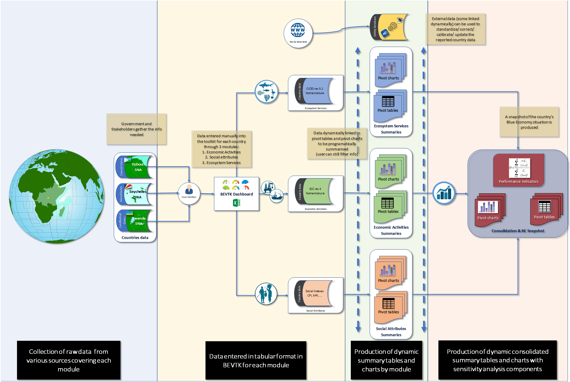 The toolkit is flexible and comprehensive enough to represent any country within the UNECA scope (coastal, insular, or landlocked). The flexibility of the toolkit was achieved through use of internationally accepted classifications and systems such as the SNA, NCA, SEEA, etc. The BEVTK is organised around three easily comprehensible modules that address the above-mentioned dimensions of human interactions with the ‘blue environment’: Economics Activities associated with the BE; Social Dimension associated with the BE; and Ecosystem Services associated with the BE.