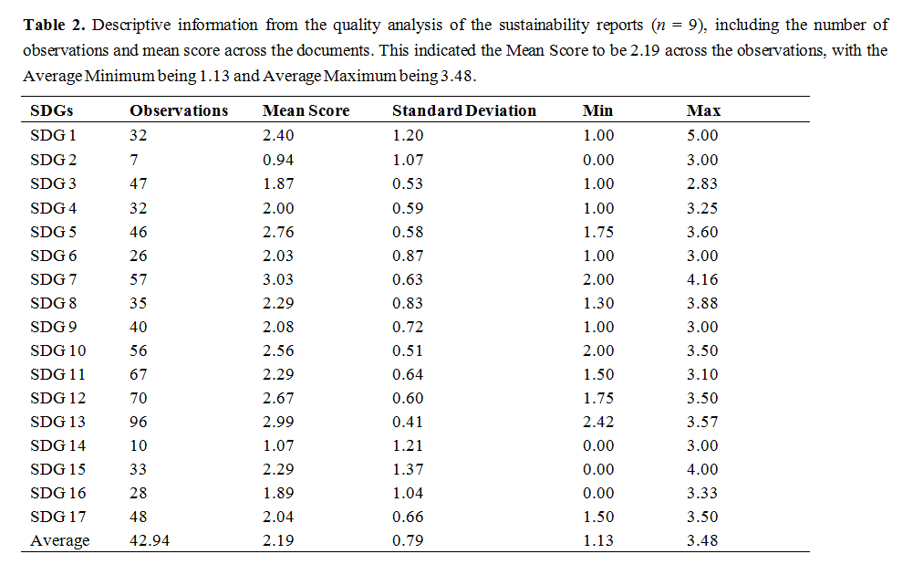 Table 2. Descriptive information from the quality analysis of the sustainability reports (n = 9), including the number of observations and mean score across the documents. This indicated the Mean Score to be 2.19 across the observations, with the Average Minimum being 1.13 and Average Maximum being 3.48.